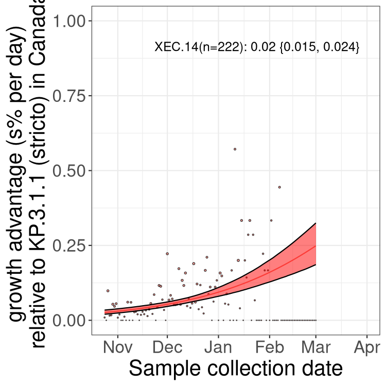 Here we examine the relative rate of spread of the different sublineages of SARS-CoV-2 currently circulating in Canada. Specifically, we determine if a new or emerging lineage has a selective advantage (s), and by how much, against a previously common reference lineage (broad scale (and in the Fastest Growing Lineages section): KP.3* and at the fine scale, against KP.3.1.1; see methods for more details about selection and how it is estimated).