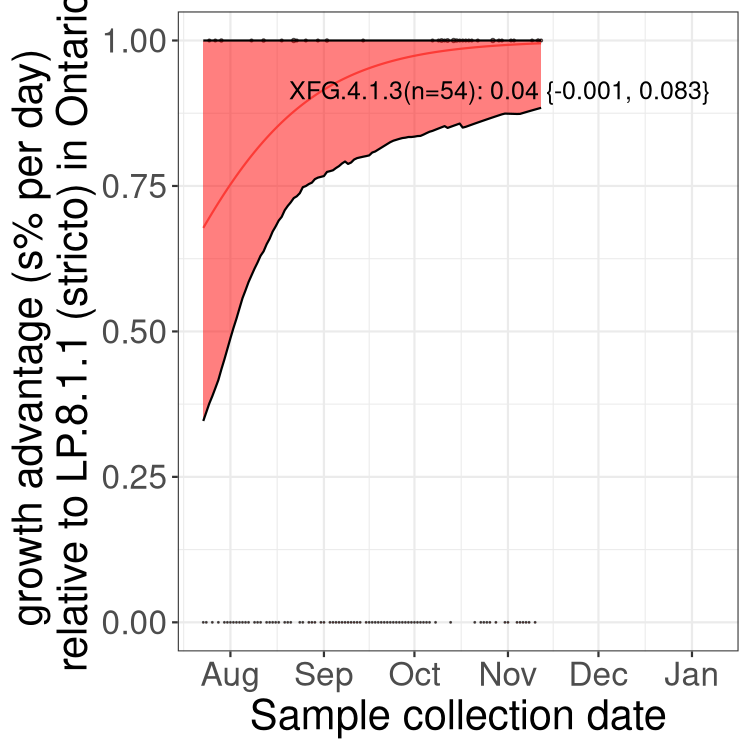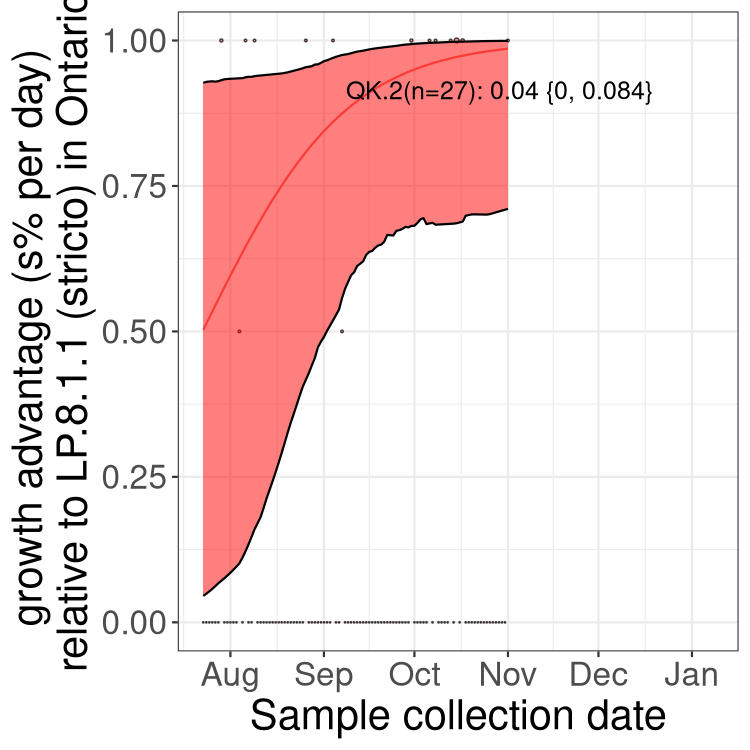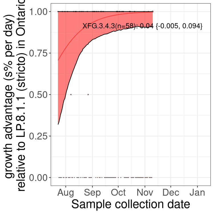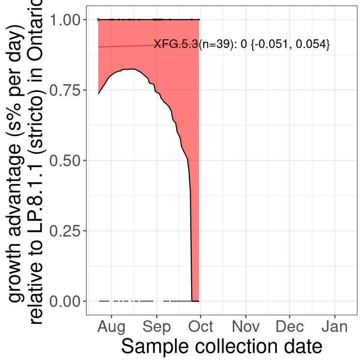 These estimates of selection ignore heterogeneity within provinces and may be biased by the arrival of travel-related cases while frequencies are very low. Sampling strategies that oversample clustered cases (e.g., sequencing outbreaks) will introduce additional variation beyond the multinomial expectation, but these should lead to one-time shifts in frequency rather than trends over time. Provinces with sampling strategies that are variant specific are removed, unless explicit information about the variant frequencies is available.