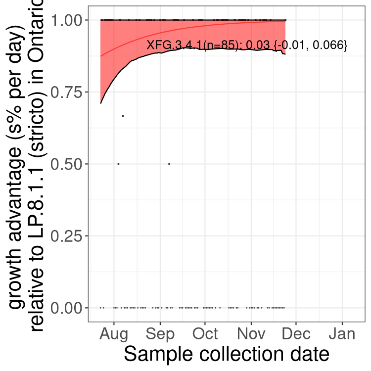 Here we examine the relative rate of spread of the different sublineages of SARS-CoV-2 currently circulating in Canada. Specifically, we determine if a new or emerging lineage has a selective advantage (s), and by how much, against a previously common reference lineage (broad scale (and in the Fastest Growing Lineages section): LP.8* and at the fine scale, against LP.8.1.1; see methods for more details about selection and how it is estimated).